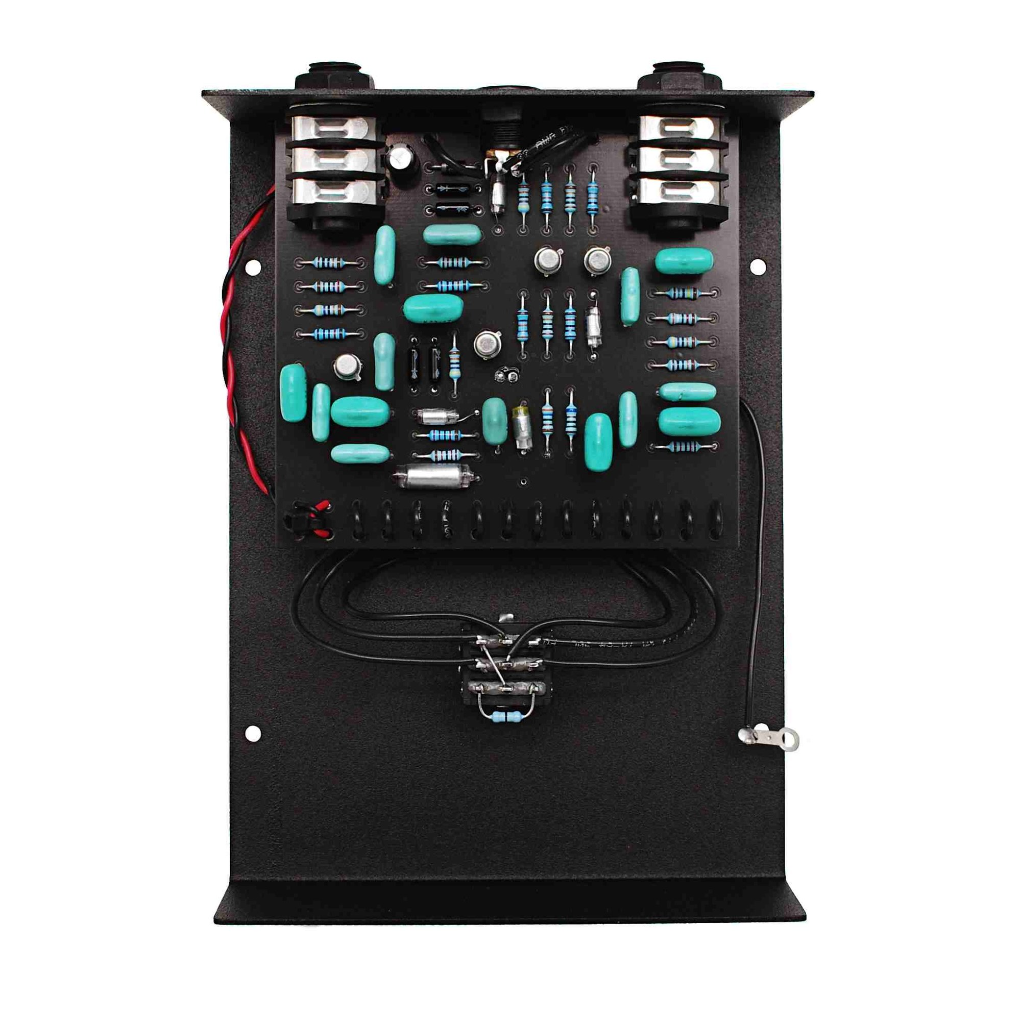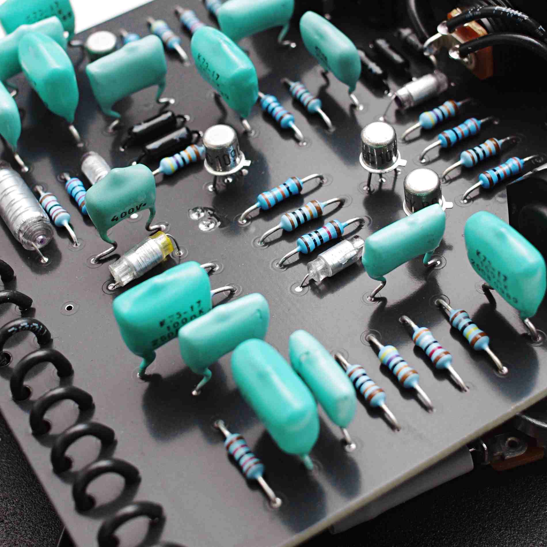 This big box version is built in similar way to original V8s in quite an oversized enclosure, with oldschool looking printed circuit board. Circuit is executed with many non-standard value parts I individually measure and select for crazy tight tolerance - all of these has been found in actual, 'out of spec' muffs I probed... call that happy accidents standardised and meticulously executed for superior tonal experience.